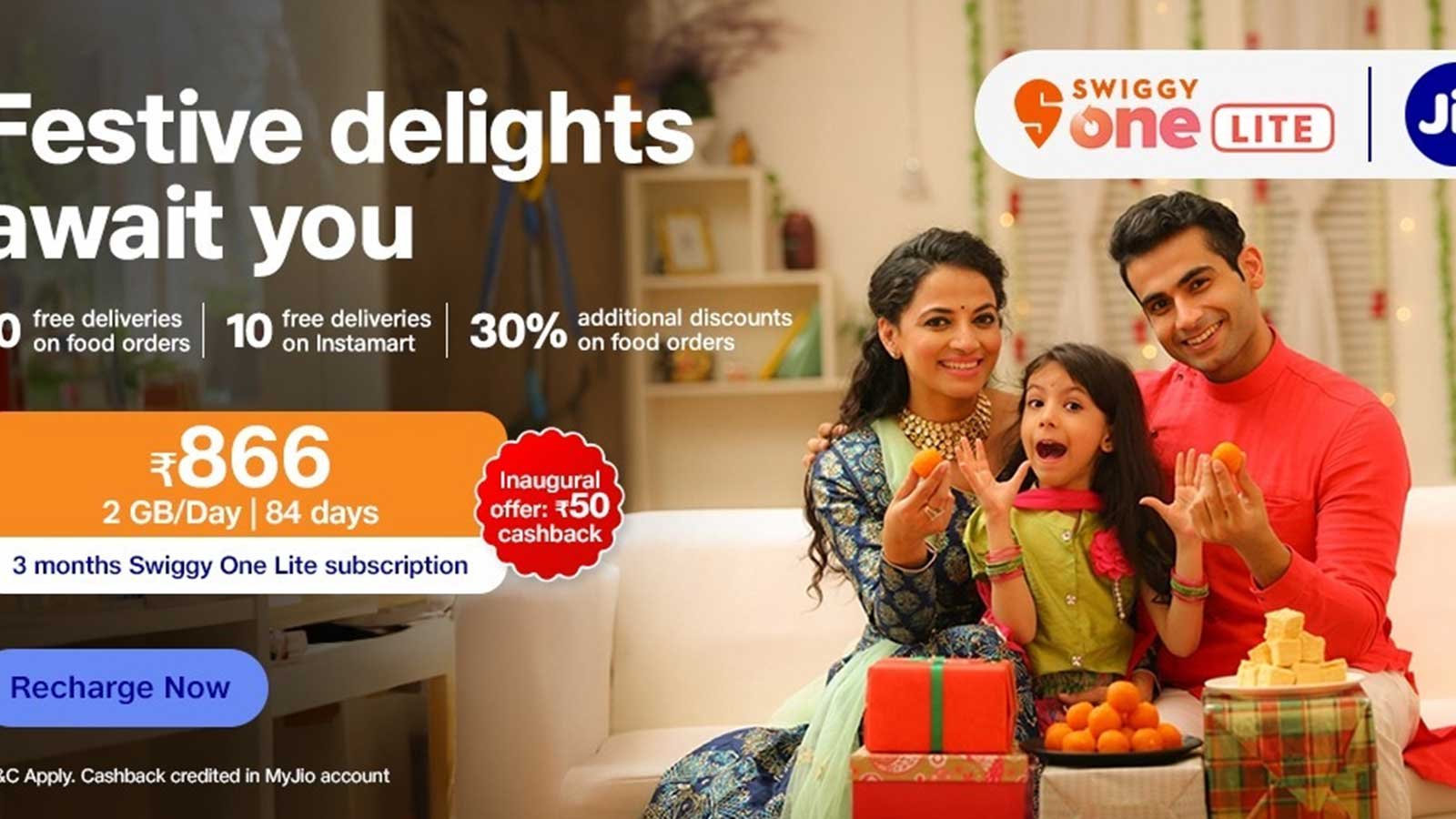 പുതിയ ജിയോ-സ്വിഗ്ഗി ഫെസ്റ്റീവ് പ്രീപെയ്ഡ് പ്ലാന് ഉപയോഗിച്ച് റീചാര്ജ് ചെയ്യുമ്പോള് ജിയോ ഉപയോക്താക്കള്ക്ക് 3 മാസത്തെ സ്വിഗ്ഗി വണ് ലൈറ്റ് സബ്സ്ക്രിപ്ഷന് ലഭിക്കും