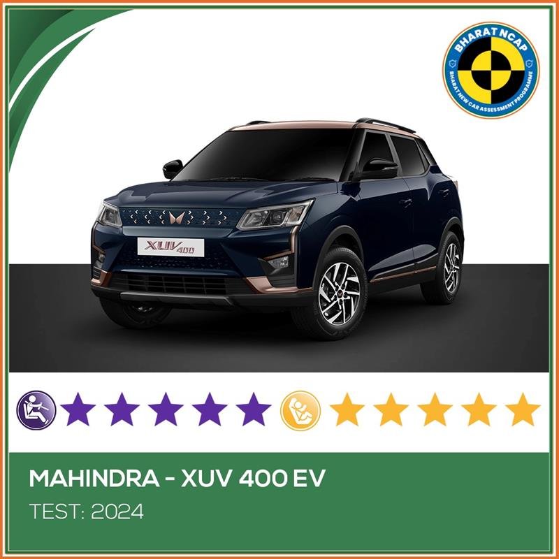 മഹീന്ദ്രയുടെ ഇലക്ട്രിക് വാഹനമായ 400 ഇവി കുട്ടികളുടെ സുരക്ഷിയില് 49 ല് 43 മാര്ക്കും മുതിര്ന്നവരുടെ സുരക്ഷയില് 32 ല് 30.38 മാര്ക്കും നേടി. രണ്ട് എയര്ബാഗുകള് അടിസ്ഥാന മോഡല് മുതലും സൈഡ് കര്ട്ടന് എയര്ബാഗുകള് ഓപ്ഷണലായും വാഹനത്തുണ്ട്. ഇഎസ്സി, പെഡസ്ട്രിയന് പ്രൊട്ടക്ഷന് തുടങ്ങിയ സുരക്ഷാ സംവിധാനങ്ങള് എല്ലാ മോഡലുകളിലും ലഭിക്കും.