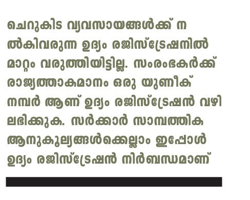 ചെറുകിട വ്യവസായങ്ങള്ക്ക് നല്കിവരുന്ന ഉദ്യം രജിസ്ട്രേഷനില് മാറ്റം വരുത്തിയിട്ടില്ല. സംരംഭകര്ക്ക് രാജ്യത്താകമാനം ഒരു യുണീക് നമ്പര് ആണ് ഉദ്യം രജിസ്ട്രേഷന് വഴി ലഭിക്കുക. സര്ക്കാര് സാമ്പത്തിക ആനുകൂല്യങ്ങള്ക്കെല്ലാം ഇപ്പോള് ഉദ്യം രജിസ്ട്രേഷന് നിര്ബന്ധമാണ്.