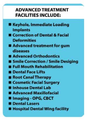 എല്ലാവിധ ഡെന്റല്, ഫേഷ്യോമാക്സിലറി ചികില്സകളും നിര്വഹിക്കാനുള്ള അത്യാധുനിക സൗകര്യങ്ങള് സ്മൈല്സെന്ററിന്റെ പ്രത്യേകതയാണ്. കുറഞ്ഞ ചെലവില് ഏറ്റവും മികച്ച ചികില്സ വാഗ്ദാനം ചെയ്യുന്നു സ്ഥാപനം. ഡെന്റല് ഇംപ്ലാന്റുകള്, ഓര്ത്തോഡോണ്ടിക് ട്രീറ്റ്മെന്റ്, സ്മൈല് ഡിസൈനിംഗ്, സ്മൈല് കറക്ഷന്, ലേസര് ഡെന്റല് ചികില്സ, ഡെന്റോ-ഫേഷ്യല് ട്രോമ അഥവാ മുഖത്തെ വിവിധ ഭാഗങ്ങളിലേല്ക്കുന്ന പരിക്കുകള്ക്കുള്ള ചികില്സ, ഇത്തരം പരിക്കുകള് ഭേദമാക്കാനുള്ള കോസ്മെറ്റിക് ജോ സര്ജറി പോലെയുള്ള സങ്കീര്ണമായ ശസ്ത്രക്രിയകള് എന്നിവയെല്ലാം ഇവിടെ ചെയ്തുവരുന്നു.