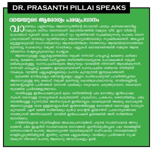 എത്രവലിയ പിണക്കവും ഹൃദയം തുറന്ന ഒരു ചിരിയില് അലിഞ്ഞു പോകാറില്ലേ? നല്ല ചിരിക്ക് അവശ്യം വേണ്ടത് നല്ല പല്ലുകള്. ആരോഗ്യവും ഭംഗിയുമുള്ള പല്ലുകളുടെ അഥവാ ചിരികളുടെ കൊച്ചിയിലെ കാത്തുസൂക്ഷിപ്പുകാരെയാണ് നാം പരിചയപ്പെടാന് പോകുന്നത്. കൊച്ചിയിലെ ഡോ. പ്രശാന്ത് പിള്ളയും അദ്ദേഹത്തിന്റെ സ്മൈല്സെന്ററുമാണ് പതിറ്റാണ്ടുകളായി ആയിരങ്ങളുടെ മുഖത്ത് സന്തോഷച്ചിരി നിറയ്ക്കുന്നത്.