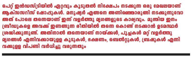 വളര്ത്തുമൃഗങ്ങളെ സ്വന്തമാക്കുക എന്നത് ഇപ്പോള് ഒരു സ്റ്റാറ്റസ് സിംബലായി മാറിയിരിക്കുകയാണ്. വിദേശയിനം വളര്ത്തു നായ്ക്കള്, പക്ഷികള്, പേര്ഷ്യന് പൂച്ചകള് തുടങ്ങി കേരളത്തിന്റെ പെറ്റ് വിപണിയില് ഇന്ന് നടക്കുന്നത് ലക്ഷങ്ങളുടെ ബിസിനസാണ്. ഡോഗ് ഷോകളും അലങ്കാരപ്പക്ഷി എക്സിബിഷനുകളും എല്ലാം വിപണിയില് സജീവമാകുമ്പോള് പെറ്റ് ആസസറീസ് ഷോപ്പുകള്, പെറ്റ് സ്പാകള്, പെറ്റ് ഹോസ്റ്റലുകള് തുടങ്ങിയ സംരംഭങ്ങളില് നിന്നും മികച്ച വരുമാനം ലഭിക്കുന്നു. ഓമന വളര്ത്തുമൃഗങ്ങള് ഇന്ന് സോഷ്യല് സ്റ്റാറ്റസിന്റെ കൂടി ഭാഗമായി കഴിഞ്ഞതോടെ ഈ രംഗത്തെ നിക്ഷേപ സാധ്യതകളും വര്ധിച്ചിരിക്കുകയാണ്.