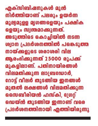 എക്സിബിഷനുകള് മുന്നിര്ത്തിയാണ് പലരും ഉയര്ന്ന മൂല്യമുള്ള മൃഗങ്ങളെയും പക്ഷികളെയും സ്വന്തമാക്കുന്നത്. അടുത്തിടെ കൊച്ചിയില് നടന്ന ശ്വാന പ്രദര്ശനത്തില് പങ്കെടുത്ത നായ്ക്കളുടെ ശരാശരി വില ആരംഭിക്കുന്നത് 25000 രൂപക്ക് മുകളിലാണ്. പതിനായിരങ്ങള് വിലമതിക്കുന്ന ലാബ്രഡോര്, റോട്ട് വീലര് തുടങ്ങിയ ഇനങ്ങള് മുതല് ലക്ഷങ്ങള് വിലമതിക്കുന്ന സൈബീരിയന് ഹസ്കി, ഗ്രേറ്റ് ഡെയ്ന് തുടങ്ങിയ ഇന്നാണ് വരെ പ്രദര്ശനത്തിനായി എത്തിയിരുന്നു. ഇത്തരം മൃഗങ്ങളെ വെറുത്തേ പ്രദര്ശനത്തിനായി എത്തിക്കുകയല്ല.