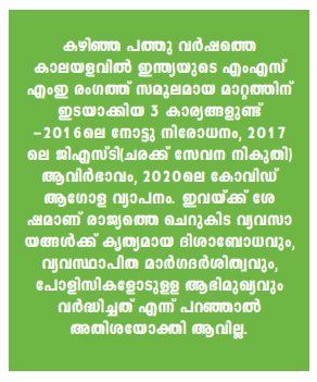 ഇന്ത്യയുടെ വാര്ഷിക ജിഡിപിയില് 30% വും എംഎസ്എംഇ മേഖലയുടെ സംഭാവനയാണ്. ഉല്പ്പാദനത്തില് 40% വും കയറ്റുമതിയില് 50% വും രാജ്യത്തിന് നല്കുന്ന മേഖലയാണിത്. സ്റ്റോക് എക്്സ്ചേഞ്ചുകളില് അഞ്ഞൂറിലധികം എംഎസ്എംഇ കമ്പനികള് ലിസ്റ്റ് ചെയ്യപ്പെട്ടിട്ടുണ്ട്. ഈ മേഖല വഴി രാജ്യത്ത് ആറുകോടിയില് പരം തൊഴിലുകള് നല്കിക്കൊണ്ടിരിക്കുന്നു. കഴിഞ്ഞ പത്തു വര്ഷത്തെ കാലയളവില് ഇന്ത്യയുടെ എംഎസ്എംഇ രംഗത്ത് സമൂലമായ മാറ്റത്തിന് ഇടയാക്കിയ 3 കാര്യങ്ങളുണ്ട്. 2016ലെ നോട്ടു നിരോധനം, 2017 ലെ ജിഎസ്ടി(ചരക്ക് സേവന നികുതി) ആവിര്ഭാവം, ഒടുവില് 2020ലെ കോവിഡ് ആഗോള വ്യാപനം എന്നിവയാണവ.