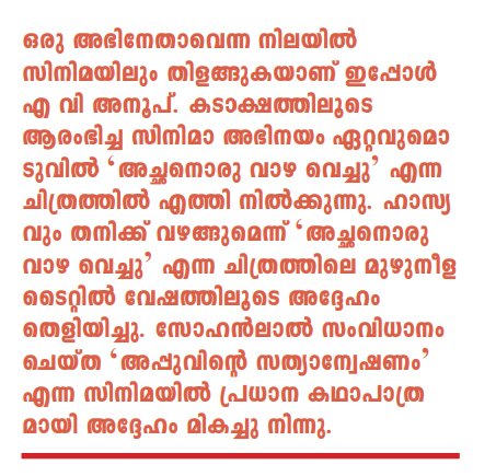 ഐഎസ്ആര്ഒയുടെ പഠന ഗവേഷണ നേട്ടങ്ങള് ചിത്രീകരിച്ച ‘യാനം’ എന്ന ഡോക്യുമെന്ററി വലിയ അംഗീകാരമാണ് നിര്മാതാവിന് നേടിക്കൊടുത്തത്. രാജ്യത്തെ 200 ലേറെ പ്രമുഖ ശാസ്ത്രജ്ഞന്മാരുടെ സാന്നിധ്യത്തില് ഐഎസ്ആര്ഒ ചെയര്മാന് ഡോ. എസ് സോമനാഥ്, എ വി അനൂപിനെയും സംവിധായകന് വിനോദ് മങ്കരയെയും ആദരിച്ചു. ഒരു അഭിനേതാവെന്ന നിലയില് സിനിമയിലും തിളങ്ങുകയാണ് ഇപ്പോള്എ വി അനൂപ്.