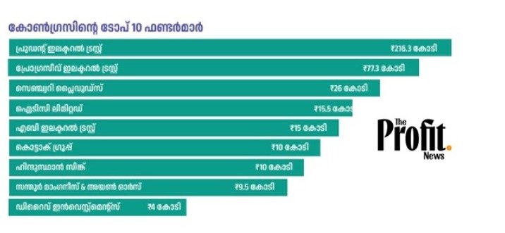 പ്രതിപക്ഷത്തുള്ള കോണ്ഗ്രസിന് പാര്ലമെന്റ് ഇലക്ഷനിലെ തോല്വിക്ക് ശേഷം ബിസിനസുകാര് കൈയയച്ച് സഹായം ചെയ്യുന്നത് നിര്ത്തിയെന്നാണ് കണക്കുകള് സൂചിപ്പിക്കുന്നത്. കോണ്ഗ്രസിന്റെ ഫണ്ട് 2023-24 ലെ 1,130 കോടി രൂപയില് നിന്ന് 522.13 കോടി രൂപയായി കുറയുകയാണുണ്ടായത്. കോണ്ഗ്രസിനെക്കാള് 12 ഇരട്ടി തുക ബിജെപി സമാഹരിച്ചെന്ന് വ്യക്തം. പ്രുഡന്റ് ഇലക്ടറല് ട്രസ്റ്റ് തന്നെയാണ് കോണ്ഗ്രസിന്റെയും വലിയ ഫണ്ടര്. എന്നാല് നല്കിയത് 216.3 കോടി രൂപ മാത്രം. അധികാരത്തിന്റെ ബലം നഷ്ടപ്പെട്ടപ്പോള് സഹായിക്കുന്നവരുടെ എണ്ണവും കുറഞ്ഞു.