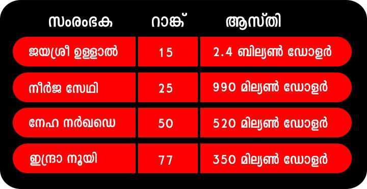 യുഎസിലെ വിജയം നേടിയ 100 സ്ത്രീകളുടെ പട്ടിക ഫോബ്സ് പുറത്തുവിട്ടപ്പോള് നാല് ഇന്ത്യന് അമേരിക്കന് വനിതാ സംരംഭകര് അതില് ഇടം പിടിച്ചു. ഇന്ദ്ര നൂയി, നേഹ നര്ഖഡെ, ജയശ്രീ ഉള്ളാല്, നീര്ജ സേത്തി എന്നിവരാണ് ഫോബ്സ് പട്ടികയില് ഇടം നേടിയ ഇന്ത്യന് വംശജരായ സെല്ഫ് മെയ്ഡ് സംരംഭകര്.