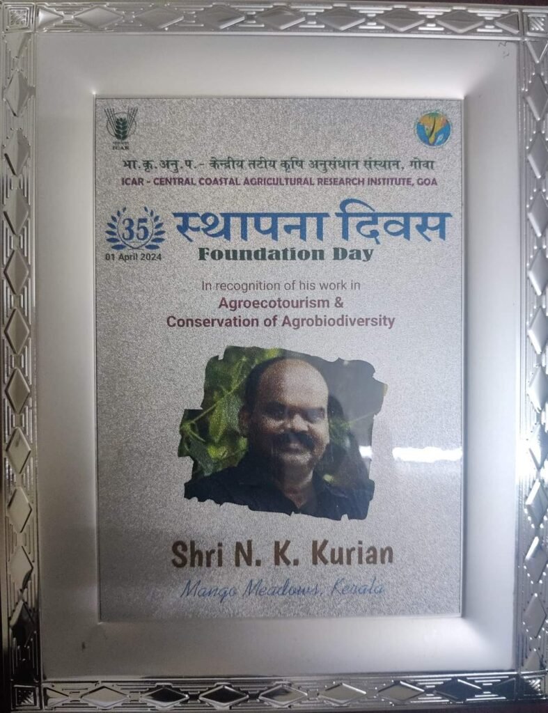 കേന്ദ്ര സര്ക്കാരിന്റെ, ഗോവ ആസ്ഥാനമായുള്ള കാര്ഷിക റിസര്ച്ച് സെന്ററായ ഐസിഎആര്-സിസിഎആര്ഐയുടെ സ്ഥാപന ദിനത്തില്, കേരളത്തിലെ ബഡോഡൈവേഴ്സിറ്റി പാര്ക്കായ മാംഗോ മെഡോസിന് പുരസ്കാരം നല്കി ആദരിച്ചു. മാംഗോ മെഡോസ് മാനേജിംഗ് ഡയറക്ടറായ എന് കെ കുര്യന് പനാജിയില് നടന്ന ചടങ്ങില് അവാര്ഡ് ഏറ്റുവാങ്ങി.