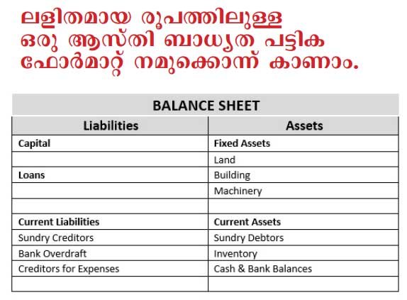 ഇതിനാണ് ബാലന്സ് ഷീറ്റ് അഥവാ ആസ്തി ബാധ്യത പട്ടിക. സംരംഭത്തിന്റെ ആസ്തികളും ബാധ്യതകളും ഏത് സമയത്തും മനസിലാക്കുവാന് ആസ്തി ബാധ്യത പട്ടിക തയ്യാറാക്കിയാല് മതി.ലാഭ നഷ്ട കണക്ക് (P & L) പോലെ തന്നെ ആസ്തി ബാധ്യത പട്ടികയും ‘T’ ഫോര്മാറ്റിലാണ് തയ്യാറാക്കുന്നത്. ഒരു ഭാഗത്ത് ആസ്തികളും (Assets) മറു ഭാഗത്ത് ബാധ്യതകളും (Liabilities) കാണിക്കുന്നു.