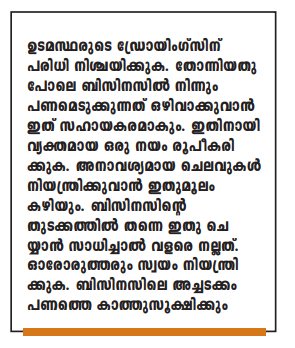 ഉടമസ്ഥരുടെ ഡ്രോയിംഗ്സിന് പരിധി നിശ്ചയിക്കുക. തോന്നിയതു പോലെ ബിസിനസില് നിന്നും പണമെടുക്കുന്നത് ഒഴിവാക്കുവാന് ഇത് സഹായകരമാകും. ഇതിനായി വ്യക്തമായ ഒരു നയം രൂപീകരിക്കുക. അനാവശ്യമായ ചെലവുകള് നിയന്ത്രിക്കുവാന് ഇതുമൂലം കഴിയും. ബിസിനസിന്റെ തുടക്കത്തില് തന്നെ ഇതു ചെയ്യാന് സാധിച്ചാല് വളരെ നല്ലത്. ഓരോരുത്തരും സ്വയം നിയന്ത്രിക്കുക. ബിസിനസിലെ അച്ചടക്കം പണത്തെ കാത്തുസൂക്ഷിക്കും.