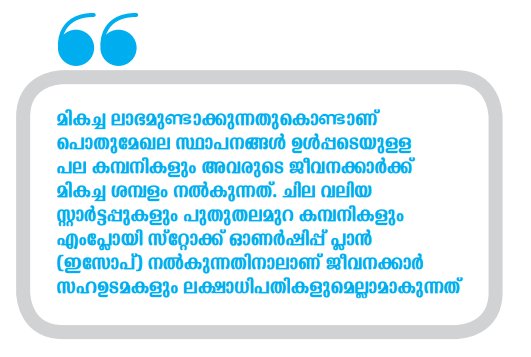 ഗൂഗിളിന്റെ സുന്ദര് പിച്ചായും മൈക്രോസോഫ്റ്റിന്റെ സത്യ നദെല്ലയുമെല്ലാം പല സംരംഭകരെയും മറികടന്ന് ശതകോടീശ്വരന്മാരായി മാറിയതും അതിനാലാണ്. വലിയ ലാഭം വരുന്നതിനാലാണ് എംപ്ലോയി സ്റ്റോക് ഓപ്ഷന് പ്ലാന് പോലുള്ളവ നല്കാന് സാധിക്കുന്നത്. ഇന്ഫോസിസ് പോലുള്ള ഉദാഹരണങ്ങള് ഇന്ത്യയിലുമുണ്ട്. അവിടെ പ്രൊമോട്ടര്മാരുടെ ഓഹരികള് ഒറ്റയക്കത്തിലേക്ക് വന്നപ്പോള് കമ്പനിയുടെ തുടക്കകാലത്തുണ്ടായ ഡ്രൈവര്മാരുള്പ്പടെയുള്ള അതിസാധാരണക്കാര്ക്ക് വലിയ സമ്പത്താര്ജിക്കാന് സാധിച്ചു. 90കള് മുതല് മികച്ച ലാഭമുണ്ടാക്കുന്ന കമ്പനിയാണ് ഇന്ഫോസിസ് എന്നതിനാലാണ് ഇത് സാധിച്ചത്.