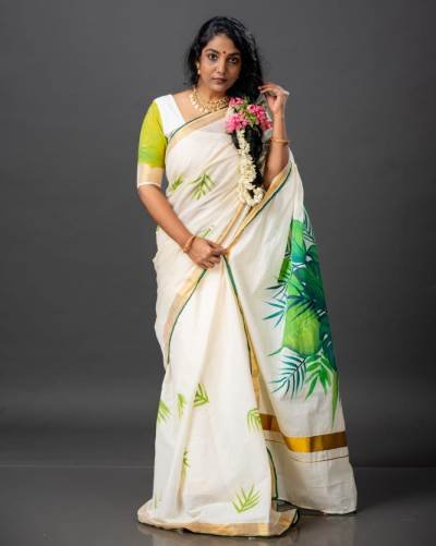 ചെസ്റ്റ് പോർഷനിൽ തെയ്യത്തിന്റെ മുഖം വരുന്ന ഡിസൈൻ ആണ് വിപണിയിൽ ഏറെ പ്രിയപ്പെട്ട മറ്റൊന്ന്. ഏറ്റവും കൂടുതൽ ആവശ്യക്കാർ എത്തുന്ന ഒന്നാണിത്. ഏതു സീസണിലും ധരിക്കാവുന്ന ഡിസൈനാണിത്. ലാളിത്യത്തിന്റെ പര്യായമായിരുന്നു കസവ് വേഷ്ടികൾക്ക് ആഡംബരത്തിന്റെ ചന്തമേകുകയാണ് ഇത്തരം പെയിന്റിംഗുകൾ. സാരിയിൽ ഡിസൈനുകൾ ഒന്നും തന്നെ ചെയ്യാതെ ബ്ലൗസിൽ മാത്രം ഡിസൈനുകൾ ചെയ്യുന്ന രീതിയും ഇപ്പോൾ വ്യാപകമാണ്.