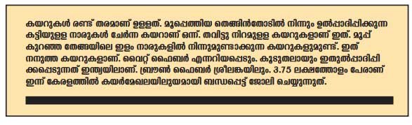കേരളത്തെ സംബന്ധിച്ചിടത്തോളം പരമ്പരാഗത വ്യവസായമാണ് കയര്. കേരള സംസ്ഥാന രൂപീകരണ വേളയില്, നമ്മുടെ ഏറ്റവും പ്രധാനപ്പെട്ട കാര്ഷികേതര മേഖല കയര് വ്യവസായമായിരുന്നു. ചകിരി നാരുകളില് നിന്ന് ഉല്പ്പാദിപ്പിക്കുന്ന കയറുല്പ്പന്നങ്ങള്ക്ക് രാജ്യത്തിനകത്തും പുറത്തും ഏറെ വിപണനസാധ്യതയാണുള്ളത്. ‘കയറുപിരിക്കും തൊഴിലാളിക്കൊരു കഥയുണ്ടുജ്ജ്വലസമരകഥ’ എന്ന് വയലാര് പാടിയത് തന്നെ കയര് വ്യവസായത്തിന്റെ പ്രാധാന്യം വിളിച്ചോതുന്നതായിരുന്നു. വടക്കേ മലബാറിലെ ബീഡി വ്യവസായം പോലെ തന്നെ ആലപ്പുഴയുടെ മണ്ണില് ഒരു രാഷ്ട്രീയബോധം സൃഷ്ടിച്ചെടുക്കാനും കയര് മേഖലയ്ക്ക് സാധിച്ചു.
